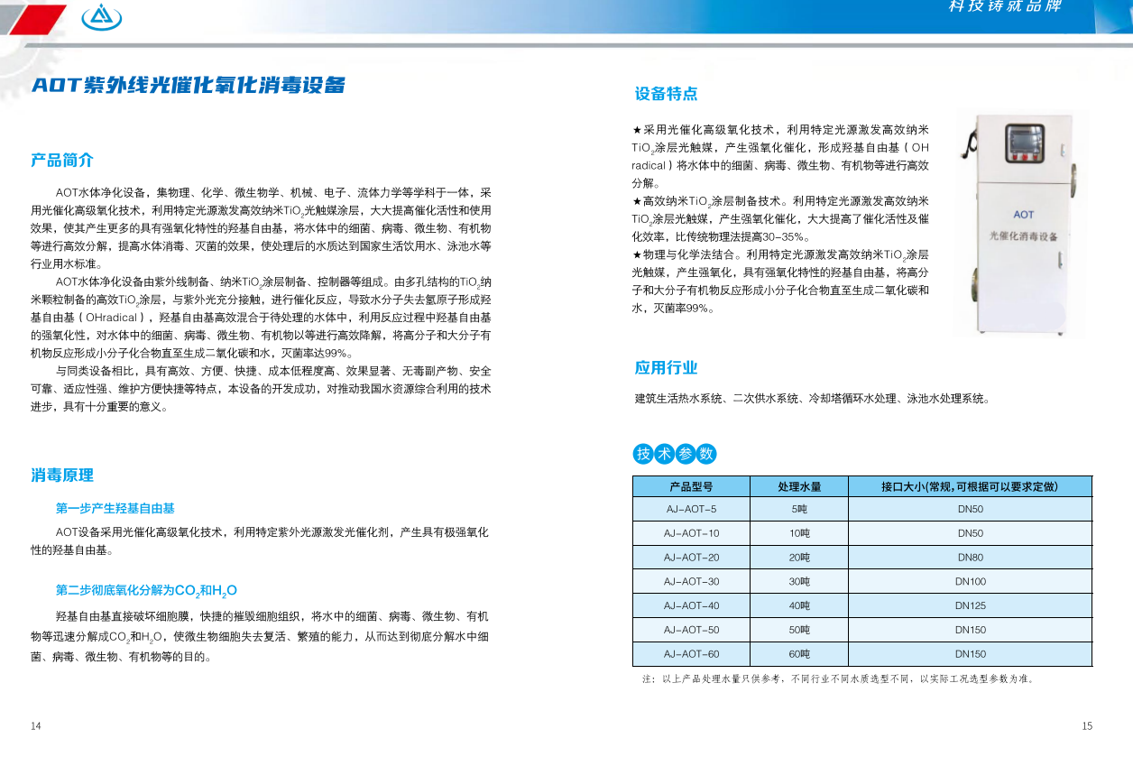 AOT光催化設備是由紫外線制備、納米 TiO2 涂層制備、控制器等組成。由多孔結構的TiO2納米顆粒制備的高效TiO2 涂層,與紫外光充分接觸,進行催化反應,導致水分子失去氫原子形成羥基自由基(OH radical),羥基自由基高效混合于待處理的水體中,利用光催化高級氧化技術對水體進行殺菌消毒。AOT摒棄了當前中國水處理工藝的多種弊端,無化學添加、無有害殘留,能夠徹底分解水中的細菌、病毒、有機化合物等并兼具節能環保、簡便適用的優點,是目前最理想、徹底的水體殺菌設備之一。